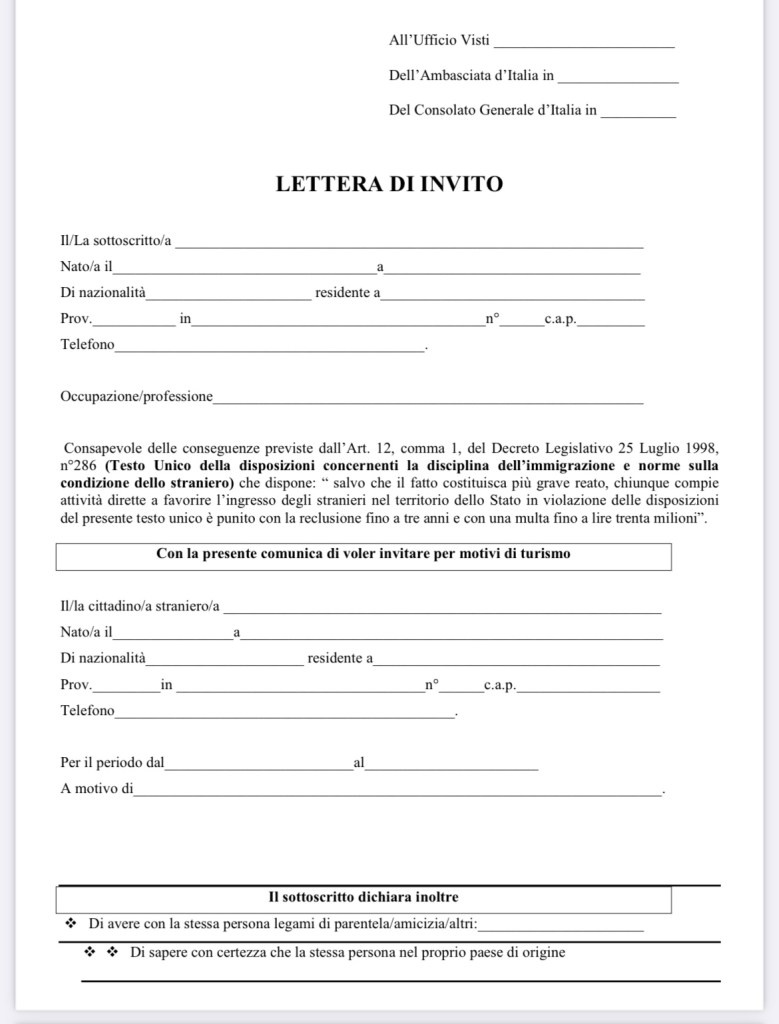 يجب على الأجنبي المقيم في إيطاليا ، أو المواطن الإيطالي ، الذي ينوي استضافة قريب أو صديق ، ملئ تصريح محدد – يسمى خطاب دعوة – يشير إلى مصاريف الرحله (السكن وأي علاج طبي للشخص المراد دعوته)