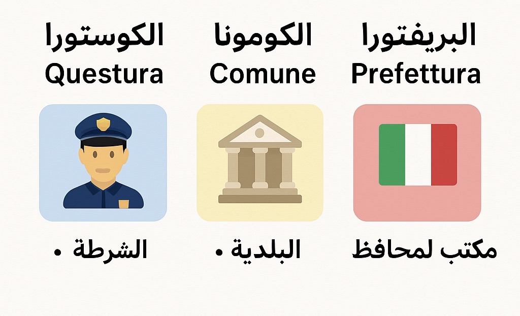 كويستورا = إقامة وشرطة بريفيتورا = جنسية وإدارة عامة كومونا = سكن وأوراق مدنية